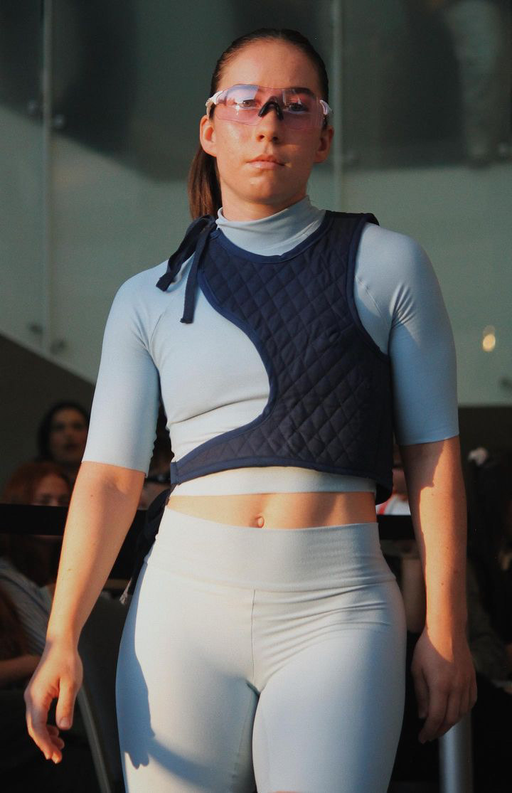 The collection, Intrepid, is inspired from the potash evaporation pools. Evaporation pools are used in the mining and harvesting of potassium chloride. The collection incorporates, colors, lines and silhouettes drawn from the pools. Brennah designs under the name hookchute.